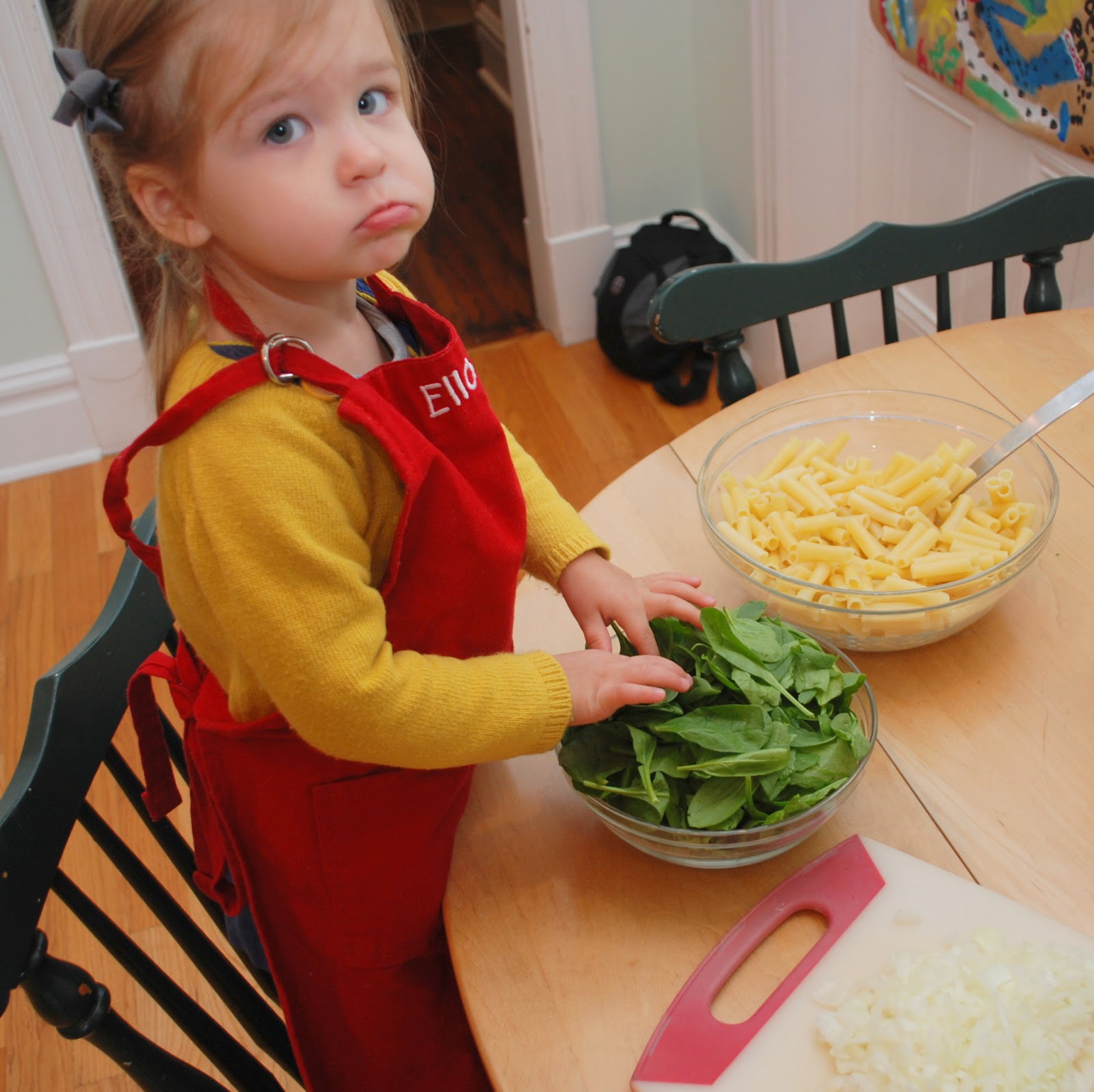 There are always little helpers underfoot – some of them sneaking pasta into their cheeks while they work.