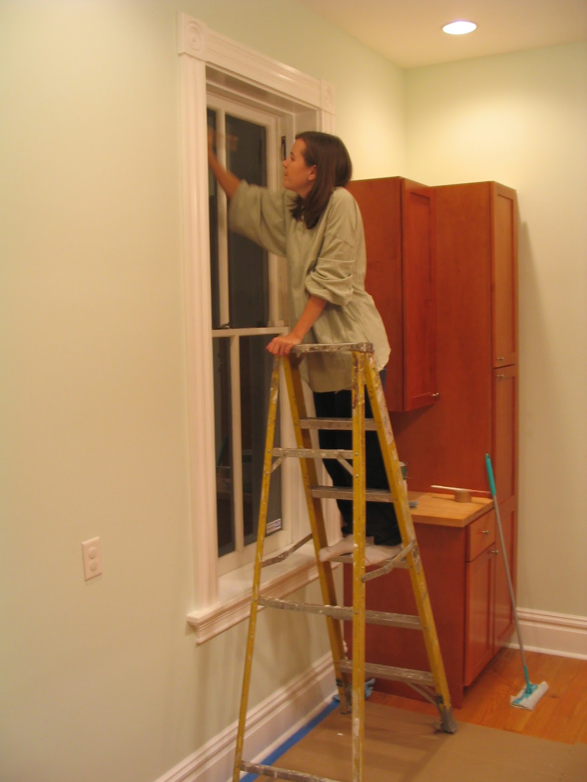 And then we started filling the other side of the kitchen with cabinets, and we finally painted the inside of that window. It looks like I graduated to M’s paint clothes at that point. I know that’s his shirt. And I also know better than to paint on a ladder in socks.