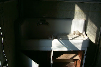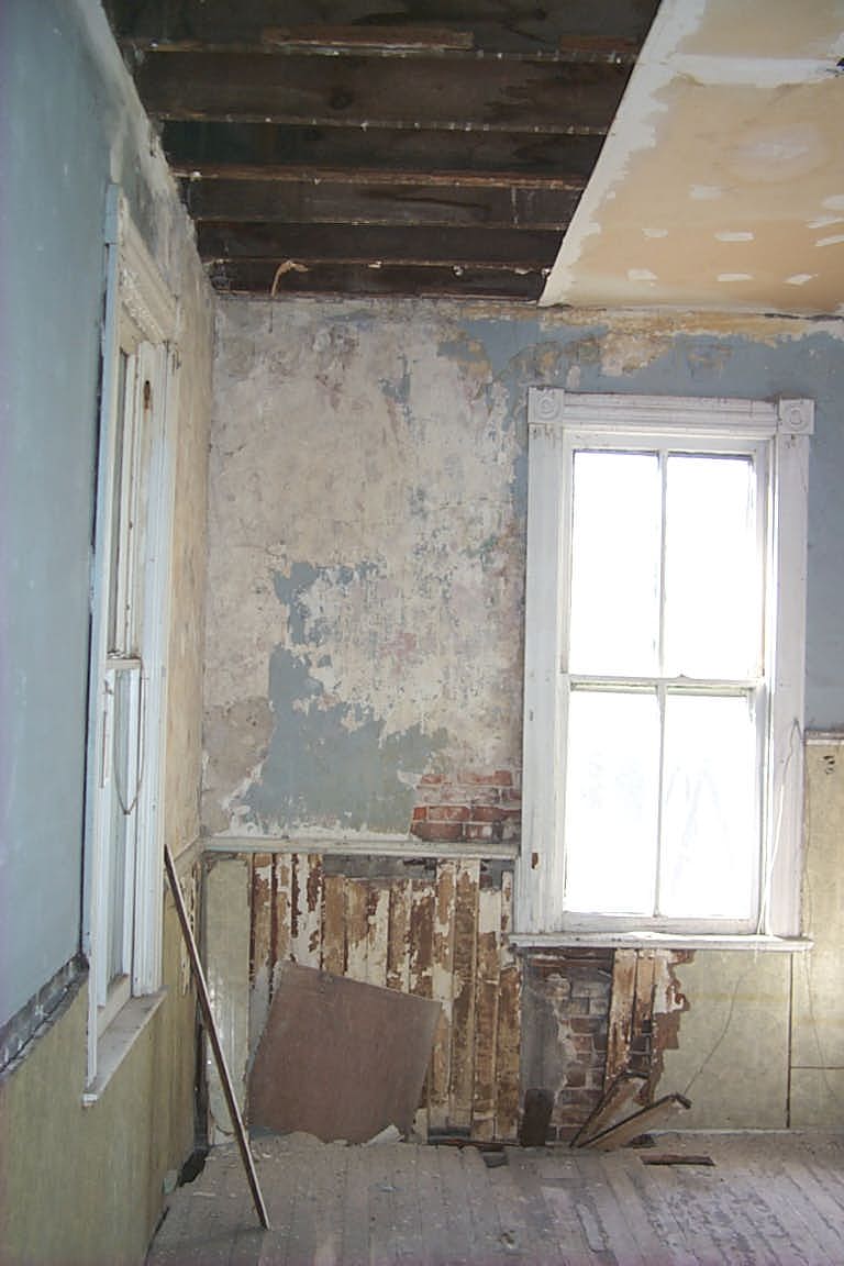 The back portion of the house is the part that suffered the most water damage in previous years with a failing (or missing) roof. The plaster in the ceiling was long gone, and some rough attempts at drywall patching had been installed. The floor was a disaster though – water damaged beyond the point of saving.