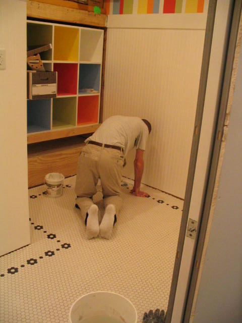 Next it was time to decide on a pattern for the black and white hex tiles. This was the fourth and final room with this tile, and we didn’t want any pattern to be the same. This simple flower motif is actually a very common pattern for the era of the house, plus it reminded me of some of the painting I did in E’s room, so we laid it out and M got busy.