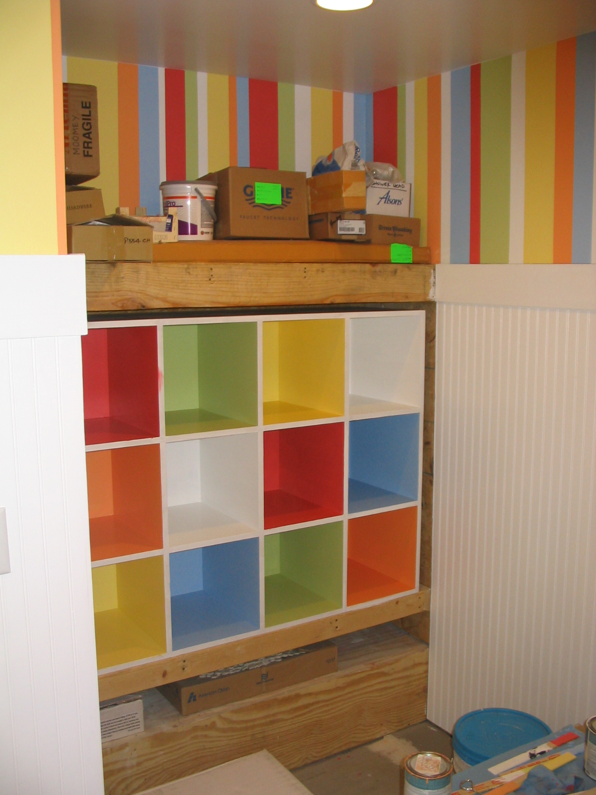 In the next picture you can really see that lower platform that houses the ducts at the bottom, and then the cubbies that we installed above it. We raised the cubbies up enough to be close to the top of the tub – it would have been strange to have storage below the edge of the tub, I think.