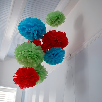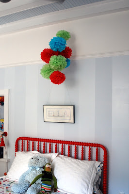 E and I decided to change up the mobile that’s been hanging over her bed since her bed was a crib. I still love that mobile, and I’m looking for other places to hang it, but these colorful tissue poufs work really well in there. Plus, we had a lot of fun making them last weekend. We might add a couple more in there, and the little one wants some in her room as well, so we might be on a bit of a pouf run around here.