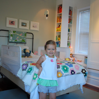 We survived the first night – although it took her a long time to key down from the excitement. Today when I got upstairs she had dressed herself and made her bed. (It’s water play day today, so that’s a skirted swimsuit under her clothes.) I still need to rehang the artwork that used to center over the crib / toddler bed. I took the bottom three down so the headboard wouldn’t hit them. I also cannot find the bed skirt – but it’s got to be in this house somewhere, so this weekend I’ll hunt it down. (That’s fake sleeping below.)