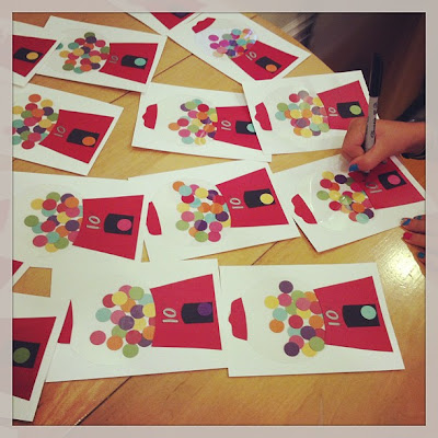 Then we sorted the gumballs by color and laid out groups of gumballs for each machine.
