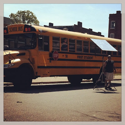 They did several takes with a school bus, and then E was on that bus, and I was across the street watching this from a few feet away.