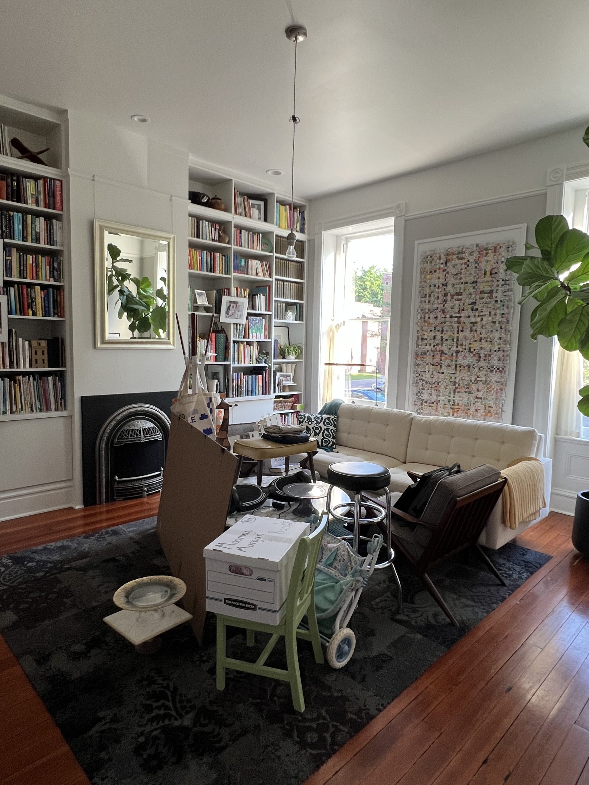 M cut up the old T&G ipe deck boards into smaller pieces, and crated them up for a future use. Our neighbors used some of our salvaged river rock on one of their landscaping projects, and now I’m going to see if I can sell the rest to other DIY’ers. I sold the last item from the basement on FB Marketplace, and we took another truckload of items to the storage unit. Mostly outdoor items like our Bertoia chairs, and some of F’s scooters and play items. I also continued to clean out items inside – I did a deep clean of the wardrobe in our dining room which acts as our mudroom. We donated old uniforms and soccer gear and violins to some neighborhood schools as well. I fashioned a large portfolio case for E’s work to store under her bed, and wrapped up one of her pieces to take for framing this weekend.