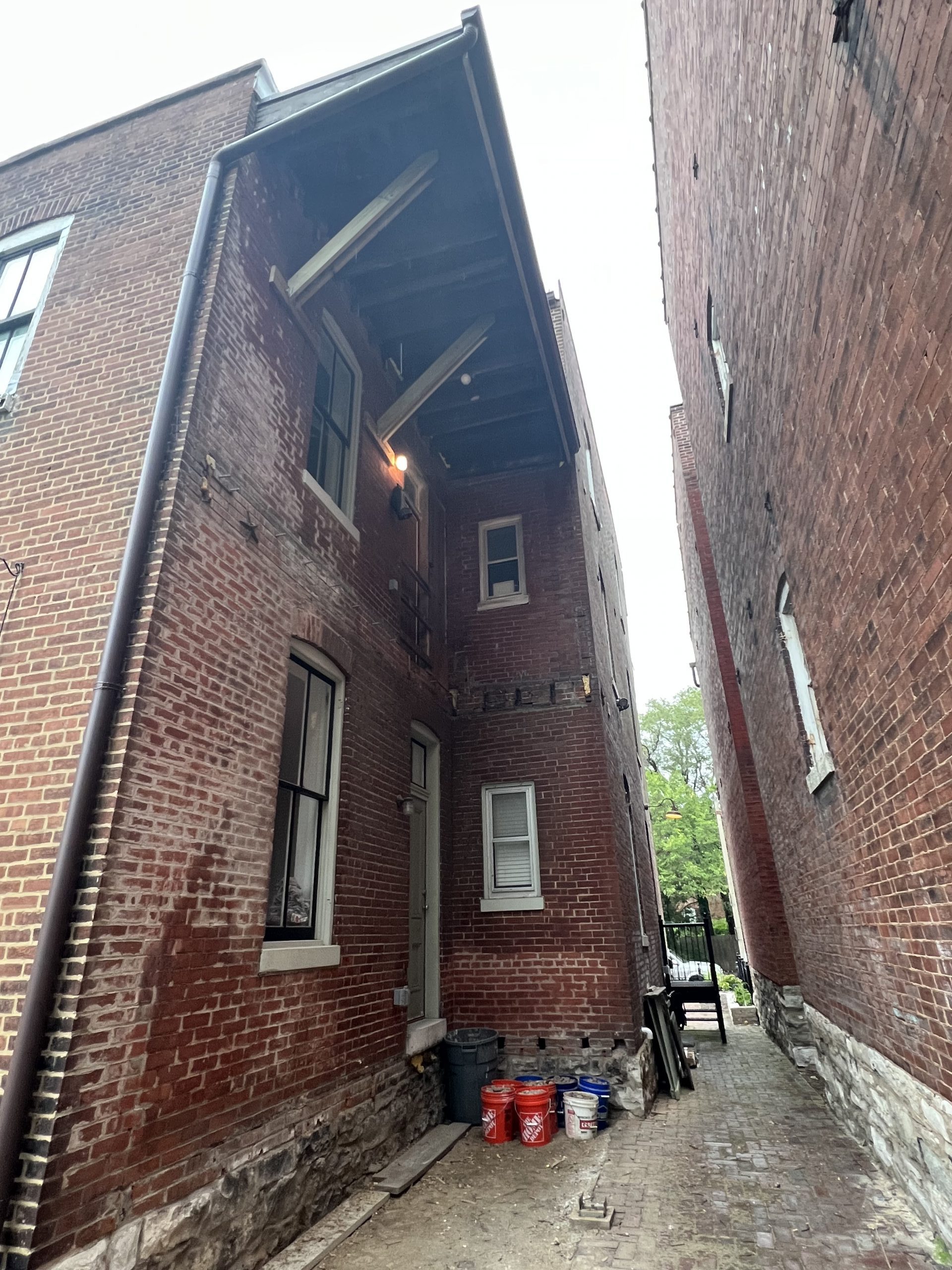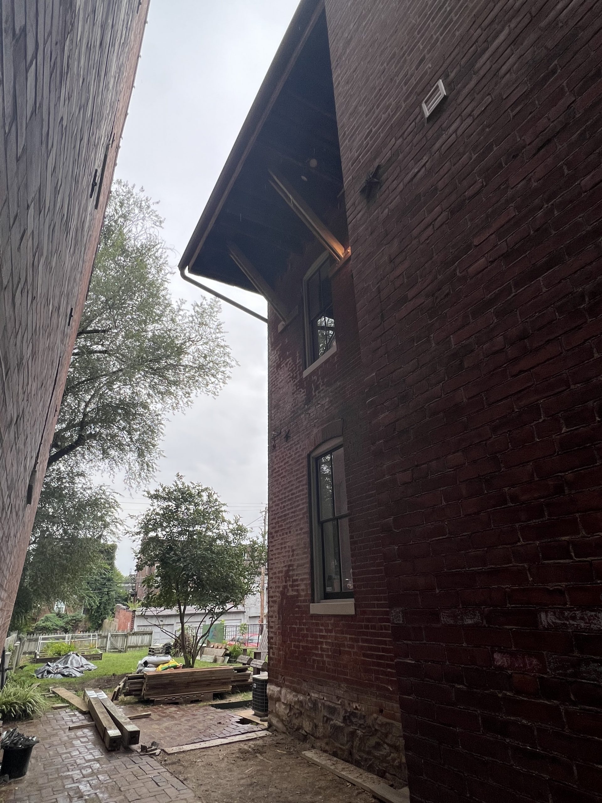 After he got the scaffolding down himself and loaded back into his truck, he returned it and we started packing up for the trip. Once we got back home, we were back at it. Most of the work we’ve done since then is cleanup work. Our neighbor has a light well in the center of his west wall which sits on our property line. If you walk from the front of our house to the rear, the tall brick wall on the left is our neighbor’s house. It can only be accessed from our property. About midway down that wall, the wall steps back, creating this light well. These were used to get more windows and ventilation into homes that were built so close together. There are windows from three rooms on each floor of his home that get some light and fresh air from this little area. But it’s not much to look at outside – we keep fresh mulch in the area, but you can’t really grow much there, and it’s not really our space to mess with.