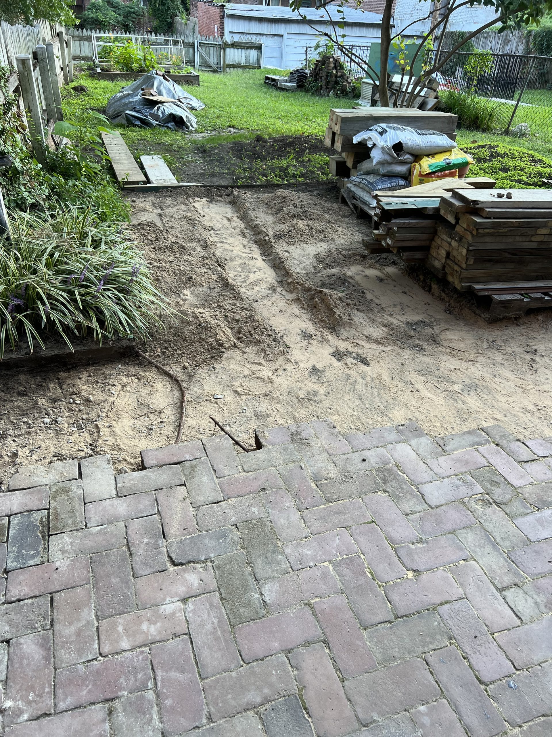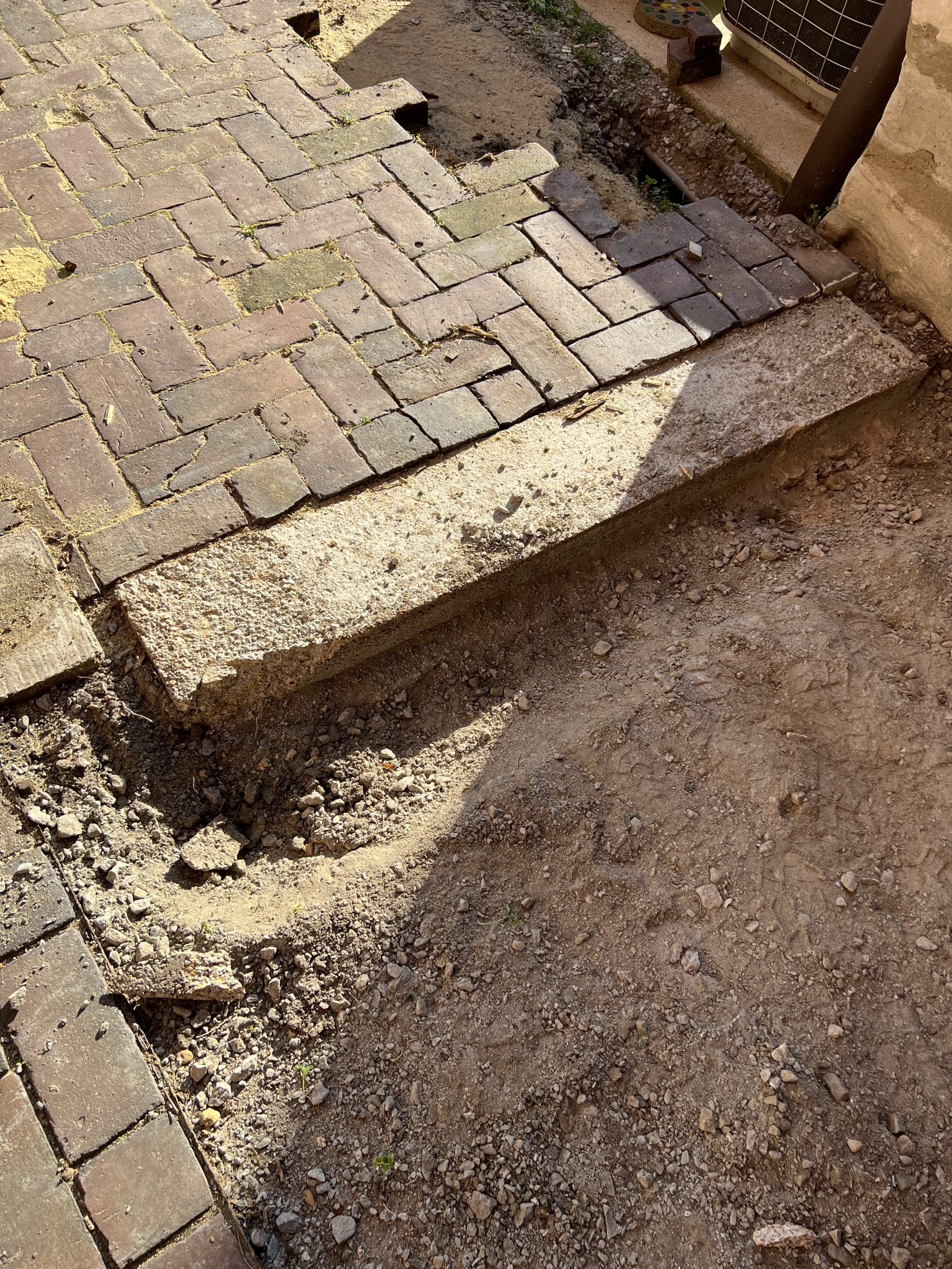 After the bricks come up, I have to move the sand as well, down to the compacted gravel base. It’s a TON of sand. I filled the tarp in the backyard, and barely made a dent, so I either need another tarped area, or we need to haul this off another way. Moving materials around a small space is annoying, and hard, sweaty, unsatisfying work. I’ll keep you posted on this progress.
